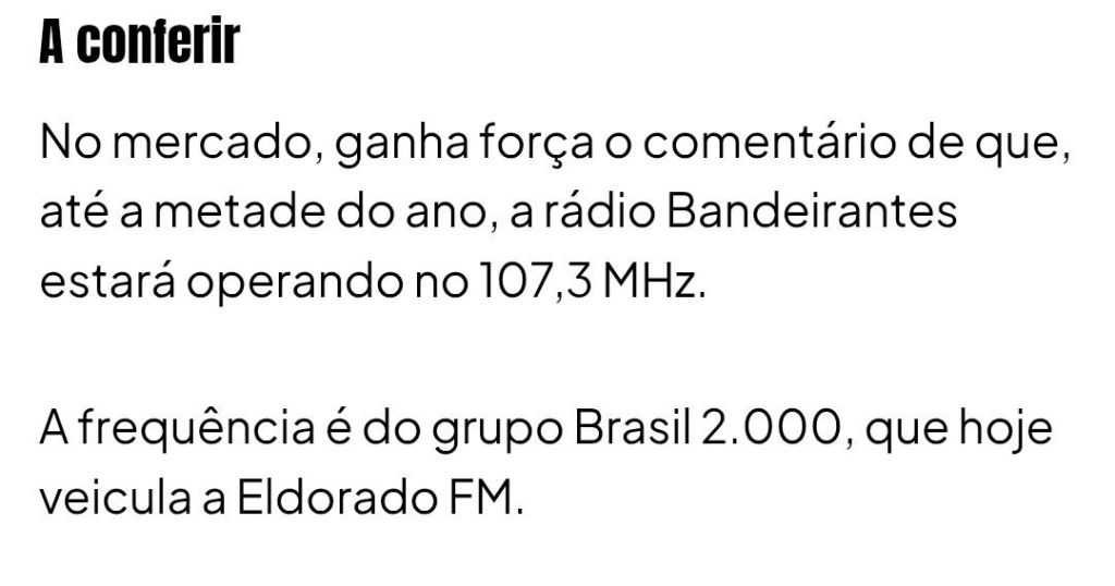 Uma “dança” de frequências poderá acontecer até a metade deste ano. Segundo o jornalista Flávio Ricco (leia aqui), a Rádio Bandeirantes planeja colocar sua programação na frequência dos 107,3Mhz em Frequência Modulada.