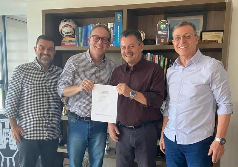 Da esquerda para a direita, diretor financeiro da FGF, Marcelo Ducati, presidente da FGF, Luciano Hocsman, presidente da Aceg, Rogério Amaral, e o secretário-geral da FGF, Mauro Rocha. Foto: Federação Gaúcha de Futebol (FGF)/Divulgação