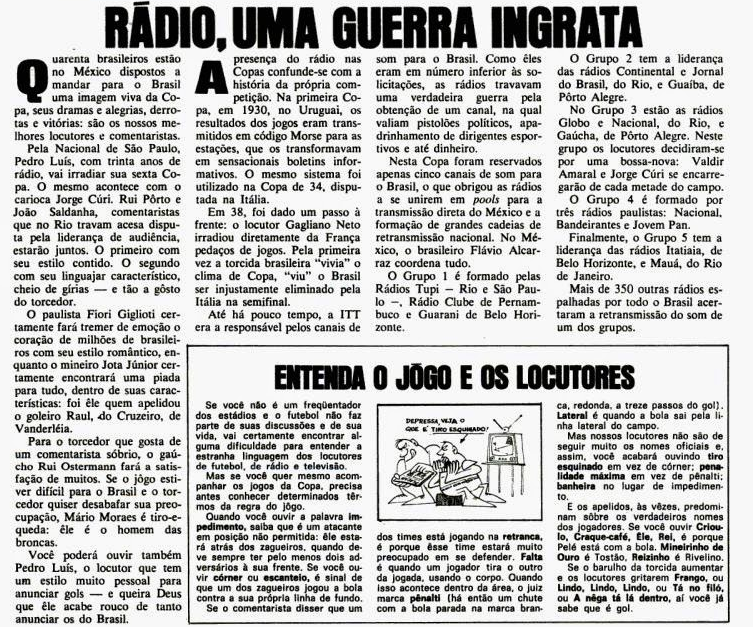 Pedro Carneiro Pereira narrou a primeira etapa de Brasil x Tchecoslováquia. E justamente aqui que temos as curiosidades mais saborosas. Como se sabe, a transmissão da Copa do México foi dividida em diversos pools (entenda mais aqui). Um deles, o de São Paulo, que envolveu as rádios Jovem Pan, Bandeirantes e Nacional (hoje Globo) enfrentou dificuldades técnicas logo de cara. A saída para essas emissoras foi usar o áudio da Guaíba-Continental, que chegava sem problemas ao Brasil. Com isso a transmissão de Pedro Carneiro, um dos maiores narradores do Rio Grande do Sul, foi ouvida pelos paulistanos. Em vários trechos de sua narração, ele informa os problemas técnicos vividos pelos paulistanos e anuncia o nome das rádios.