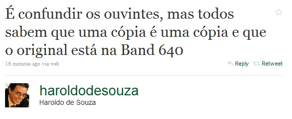 Pelo Twitter, seu Tuta, da Jovem Pan, critica Rádio Bradesco
